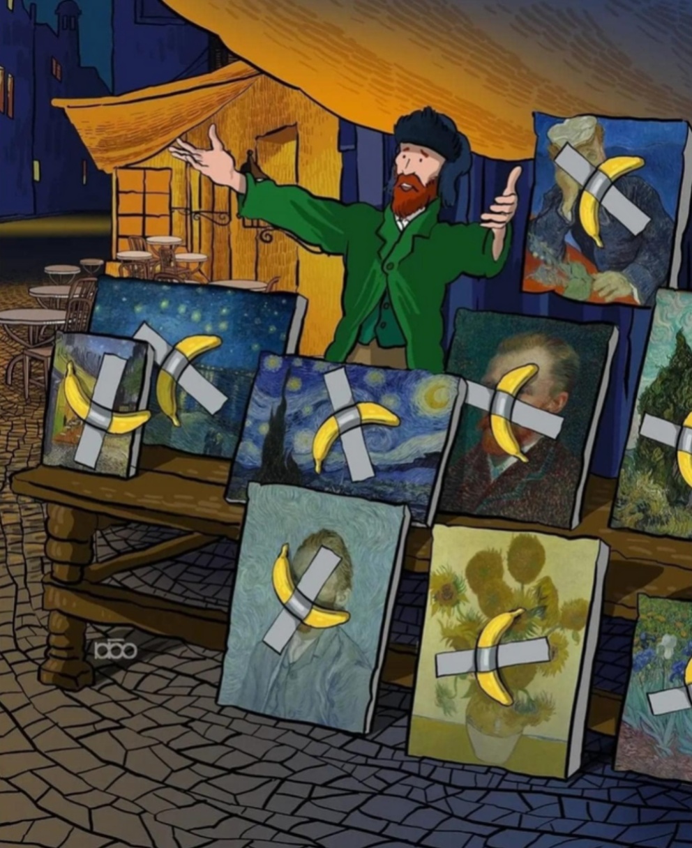 "В 2019 году итальянский художник Маурицио Каттелан представил публике произведение под названием "Комедиант" – приклеенный к стене банан. В пояснительных документах было указано, что "Комедиант" существует в трёх экземплярах, каждый из которых сопровождается сертификатом подлинности с подписью автора и подробной инструкцией, как хранить и выставлять шедевр. В частности, оговаривались вид и длина отрезка клейкой ленты, которой банан крепится к стене, высота крепления и угол наклона, под которым банан должен быть приклеен. Поскольку бананы быстро портятся, фрукт (простите, учёные, с точки зрения ботаники банан – это ягода) рекомендовалось каждые 7–10 дней менять на свежий.